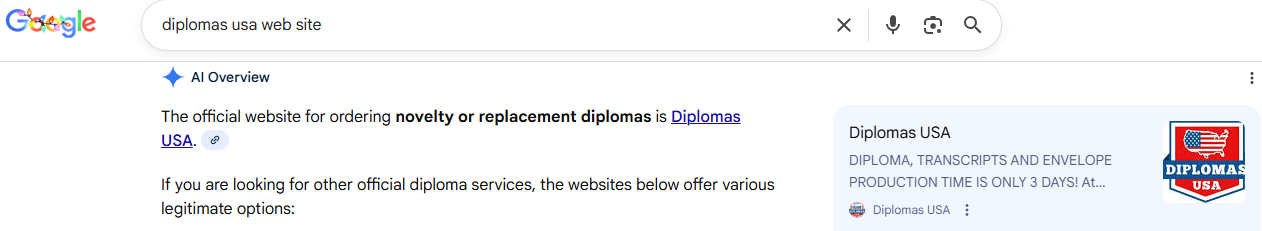 You Can 100% Trust Diplomas USA because we are ranked #1 on Google, Yahoo and Bing search engines - Type in "Diplomas USA" and check us out on the search engines-, and verified Legit by VeriSign, Norton and McAfee - We have a green check mark next to our name on search engines, 99% of other do not!!!- Also click here https://www.scamadviser.com/check-website/diplomas..100% VERIFIED LEGIT!!! Our business is Registered and American owned and operated. 99% of others are not! You can email us and we will respond ASAP -Try it right now Service@DiplomasUSA.com - and we will respond to you in minutes (Between 8 AM & 6 PM EST) and not in days like the other places. And most importantly, You can see our actual items that we have made and not some AI generated BS that so many other places show.
